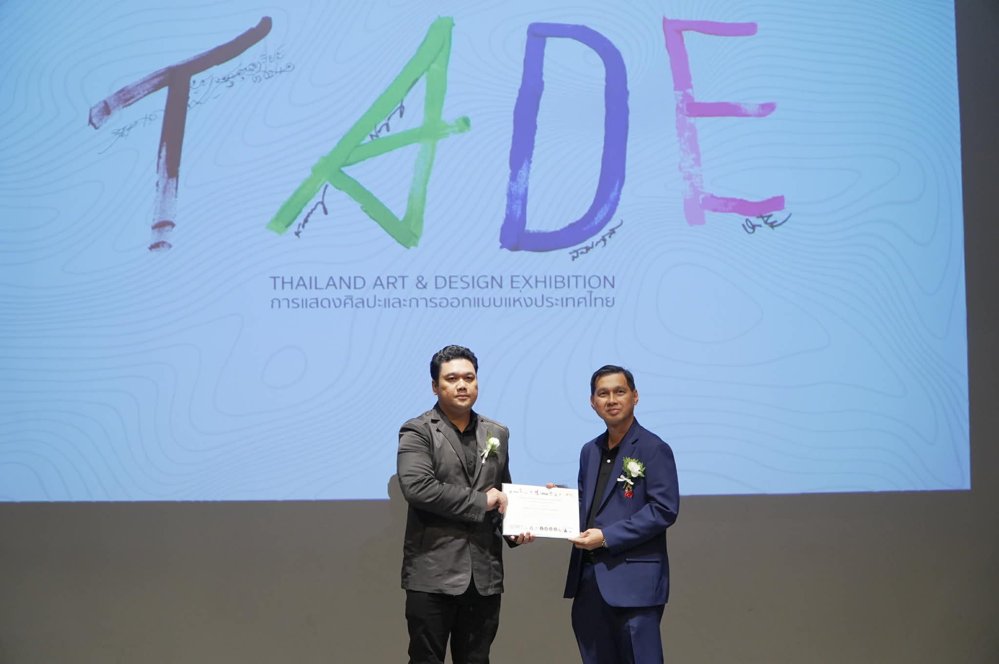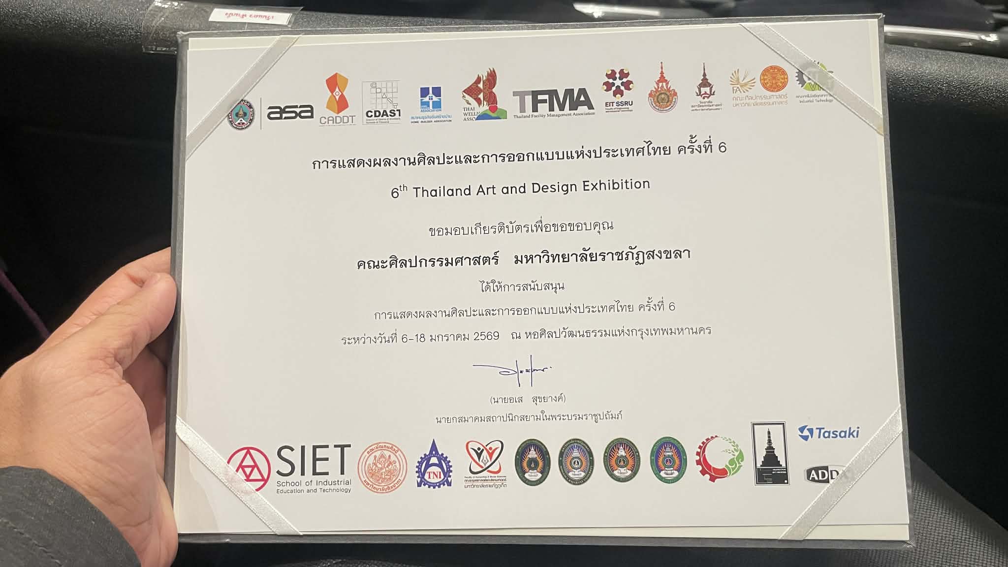 เมื่อวันที่ 9 มกราคม พ.ศ.2569 อาจารย์วงศ์วรุตม์ อินตะนัย รองคณบดีฝ่ายวิชาการและบริการวิชาการ คณะศิลปกรรมศาสตร์ เป็นตัวแทนคณบดี ร่วมพิธีเปิด และรับมอบเกียรติบัตร ในนามของเจ้าภาพร่วมจัดงานการแสดงผลงานศิลปะและการออกแบบแห่งประเทศไทย The 6th Thailand Art and Design Exhibition โดยสมาคมสถาปนิกสยามในพระบรมราชูปถัมป์ เป็นเจ้าภาพหลัก ณ หอศิลปวัฒนธรรมแห่งกรุงเทพมหานคร มีผู้เข้าร่วมเป็นคณาจารย์ นักศึกษา และบุคลากรทางการออกแบบในภาคีเครือข่าย ซึ่งได้รับการคัดเลือกให้จัดแสดงผลงานทางวิชาการประเภทงานสร้างสรรค์และการนำเสนอผลงานวิจัย ตามเกณฑ์ประกาศ ก.พ.อ. โดยผ่านการประเมินคุณภาพจากผู้ทรงคุณวุฒิ ประกอบด้วย กลุ่มสถาปัตยกรรมศาสตร์ กลุ่มวิจิตรศิลป์ และกลุ่มประยุกต์ศิลป์ ในครั้งนี้มีการนำเสนอบทความวิจัย เรื่อง “การออกแบบคาแรคเตอร์ดีไซน์โดยมีแรงบันดาลใจจากอัตลักษณ์พหุวัฒนธรรมย่านเมืองเก่าสงขลาสู่ผลิตภัณฑ์ของที่ระลึก” โดย อาจารย์วงศ์วรุตม์ อินตะนัย ซึ่งได้รับการตีพิมพ์ในรายงานการประชุม (Proceedings) รูปแบบออนไลน์ ผ่านเว็บไซต์ https://tade6.ssru.ac.th และบทความวิจัยเรื่อง “การพัฒนากระดาษกระจูดสาหรับผลิตมาลัยเพื่อใช้ในการตกแต่ง” โดย อาจารย์อมรรัตน์ บุญสว่าง ได้รับการคัดเลือกให้ตีพิมพ์ในวารสารดีไซต์เอคโค คณะวิศวกรรมศาสตร์และเทคโนโลยีอุตสาหกรรม มหาวิทยาลัยราชภัฎสวนสุนันทา การดำเนินกิจกรรมของคณะศิลปกรรมศาสตร์ มหาวิทยาลัยราชภัฎสงขลา ในครั้งนี้ สอดคล้องแนวทางการพัฒนางานสร้างสรรค์และงานวิจัยในสาขาศิลปะและการออกแบบ การพัฒนาบุคคลากร ตลอดจนการเผยแพร่ผลงานด้านวิชาการศิลปะและการออกแบบให้แก่ผู้ที่สนใจ อีกทั้งยังเป็นการสร้างเครือข่ายงานวิจัยและงานสร้างสรรค์ร่วมกับหน่วยงานทั้งภาครัฐ ภาคเอกชนและสถาบันการศึกษาด้านศิลปกรรมด้วยอีกทางนึง